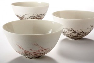 Shannon’s latest exhibition work articulates landscape using domestic pots as vessels for drawings about the strange beauty and wonder to be found in the marginalized eco-systems of the littoral zone. Images, bird-footprints, tiny flowers completely covered in white hairs, the myriad detail of the landscape has been collected into marks. A visual language mapping the experience of being in the landscape, creating a dialogue between domestic life and nature.