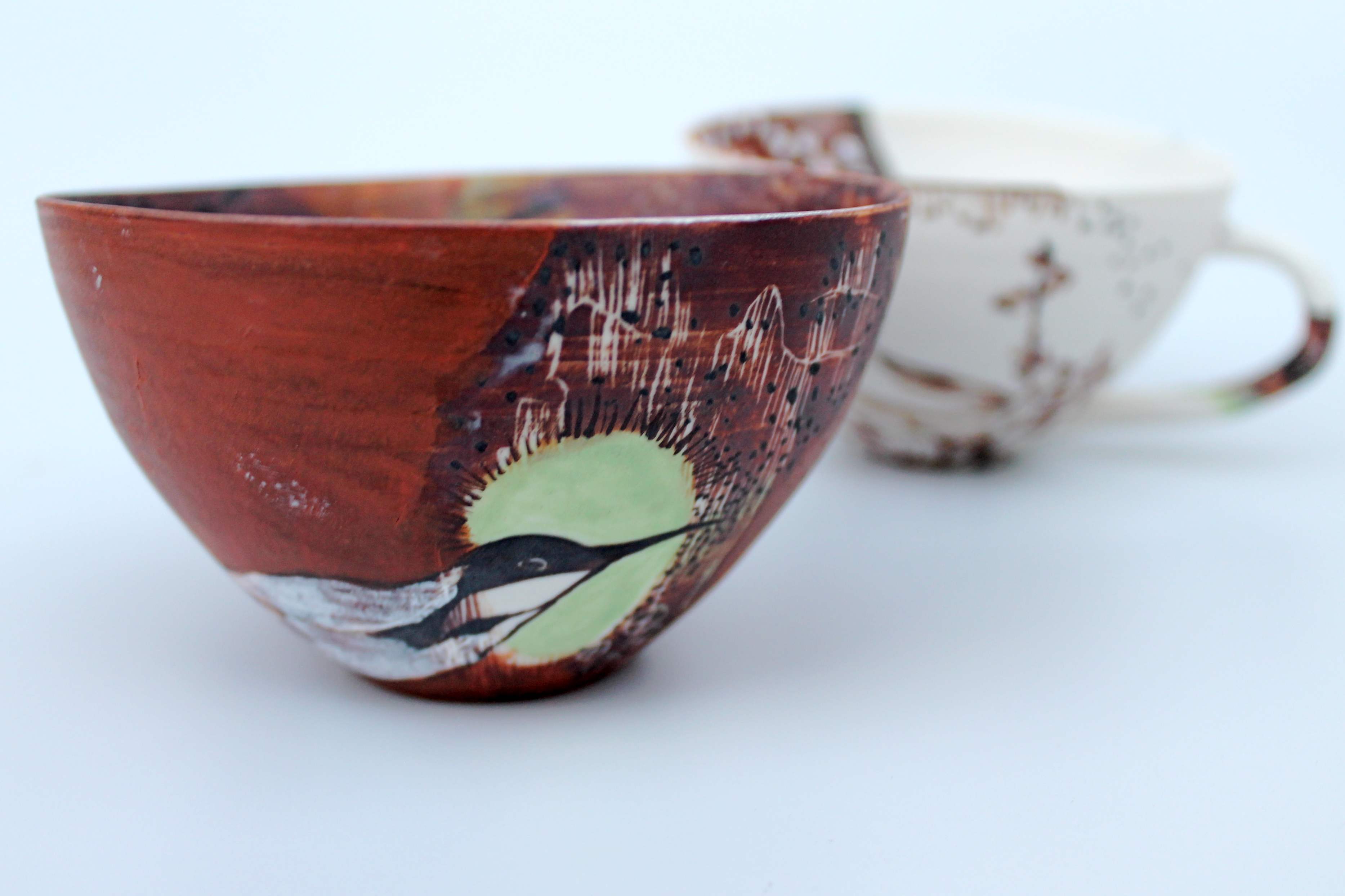 My designs are mostly inspired by the richness of colour and the diversity of Australian birdlife. I choose to work with white earthenware clay in combination with coloured underglazes as this gives me the wide palette I need.