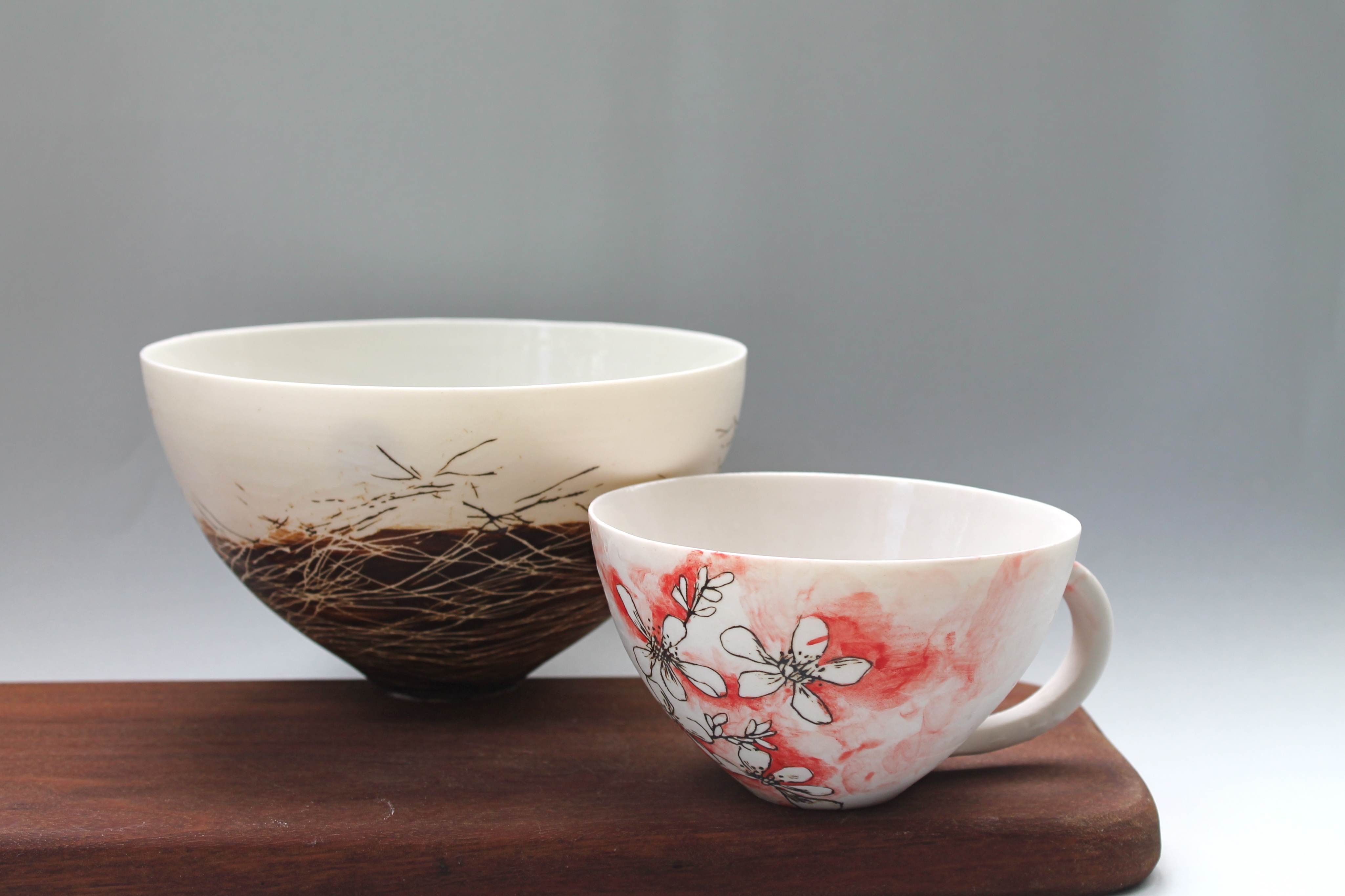 Starting with an idea this work is an expression of what the artist finds elegant and beautiful in her world. Inspiration is seeded in her observations in nature; in capturing colour and narrative with purpose onto clay. Each piece is wheel formed and hand painted individually by the artist.